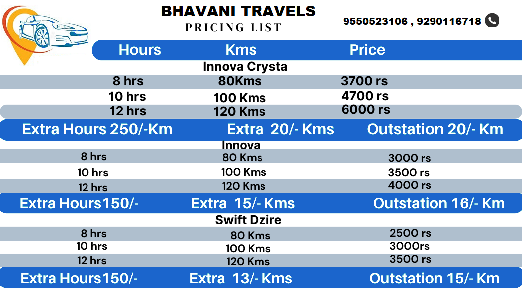 Bhavani Travels in Hyderabad is a trusted name in the travel and transportation industry, offering a wide range of reliable and affordable services. They specialize in Car on Hire, Car Rental Services, Outstation Car Rentals, and Wedding Car on Rent, catering to both personal and professional needs. Whether you need Luxury Cars, AC/Non-AC Cars, or Tempo Travellers on Rent, Bhavani Travels ensures comfortable and safe journeys. Their Airport Pickup and Drop Services are punctual and hassle-free, making them a top choice for local and corporate clients. They also provide attractive Srisailam Tour Packages, offering well-planned, spiritually enriching trips. With a focus on quality service, Bhavani Travels stands out as one of the best travel partners in Hyderabad.